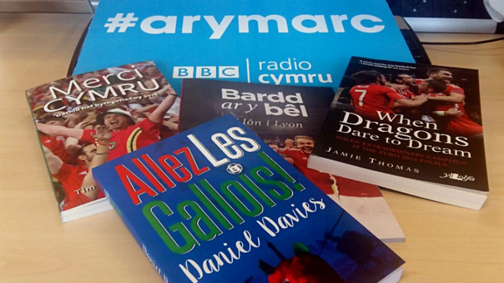 Bryn Tomos yn pori drwy rai o lyfrau pel-droed yr Euros