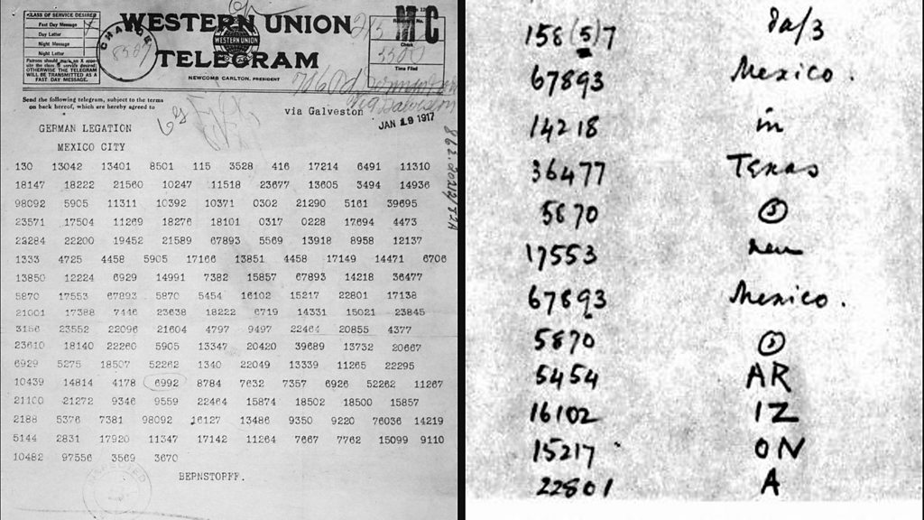 In 1917, British code-breakers exposed a German plot against the United States which helped alter the course of World War One . The Americans had remained neutral during the first three years of war, but by 1917, Germany was planning to restart unrestricted submarine warfare which it feared would trigger America's entry into the war on the Allied side. German foreign minister, Arthur Zimmermann, proposed a Mexican attack on the United States. Photo: (L) The Zimmermann telegram in code as sent from Washington to Mexico (R) A portion of the telegram as decrypted by British intelligence.(US National Archives and Record Administration)