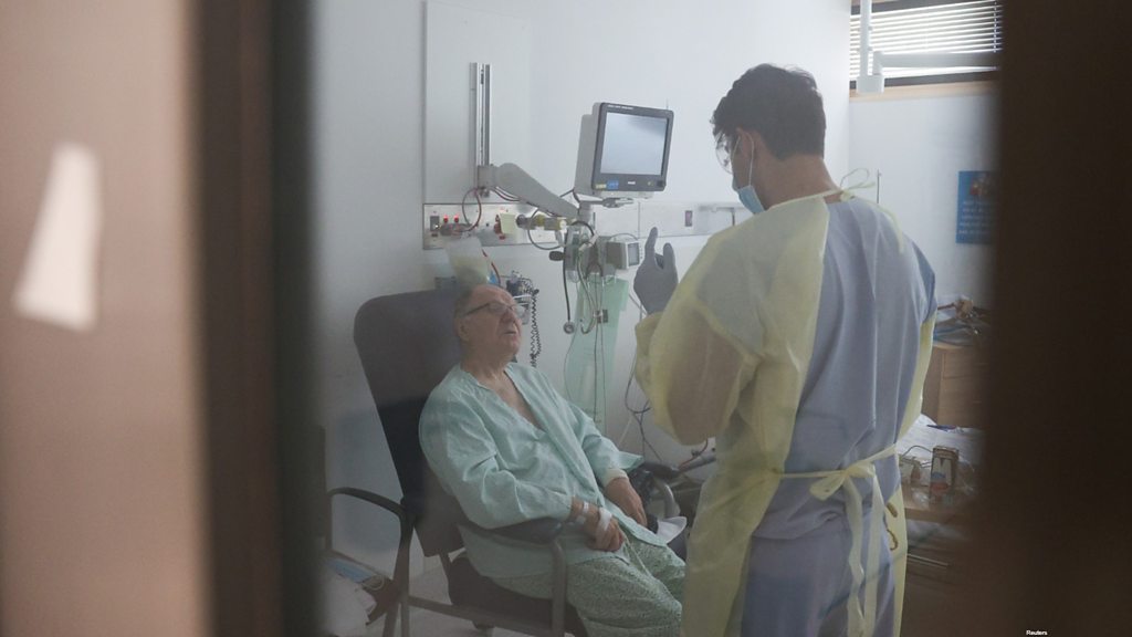 PM listener Chris Bridges, a specialist palliative care nurse, shares in his Covid Chronicle how his working life has changed during the pandemic. (Photo: Covid Nurse, seen through window, with patient Credit:Reuters)