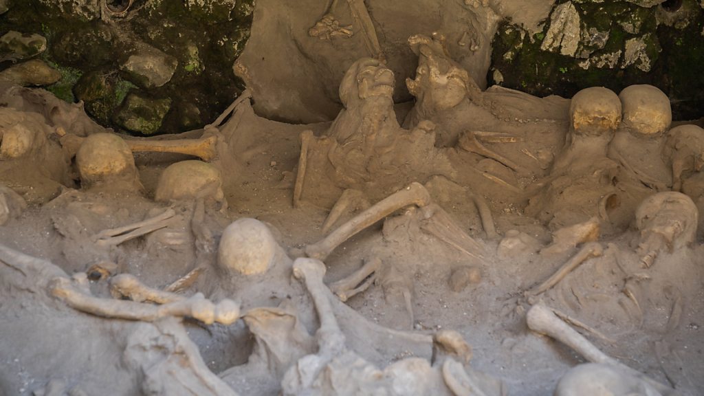 Archaeologists have been doing a molecular analysis of a protein found to survive in the bones of unfortunate victims of the Mount Vesuvius eruption that destroyed Pompeii. Despite the searing heat that killed inhabitants of nearby Herculaneum, Oliver Craig of York University has been able to examine the different isotopes in amino acids still recoverable from their bones. This helped him identify what types of food they ate during their tragically foreshortened lifetimes. (Image: Skeletal remains from Herculaneum after tragedy of eruption of Mount Vesuvius, Italy, Credit: siete_vidas / Getty Images.)