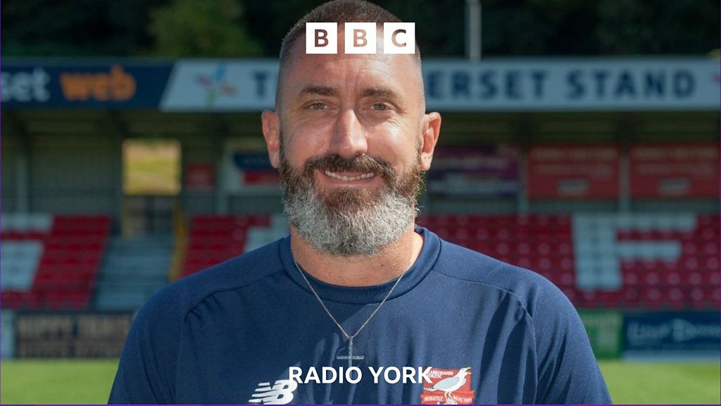 Scarborough Athletic manager Jonathan Greening speaking to Peter Spencer, ahead of their final game of the season against Bedford Town.