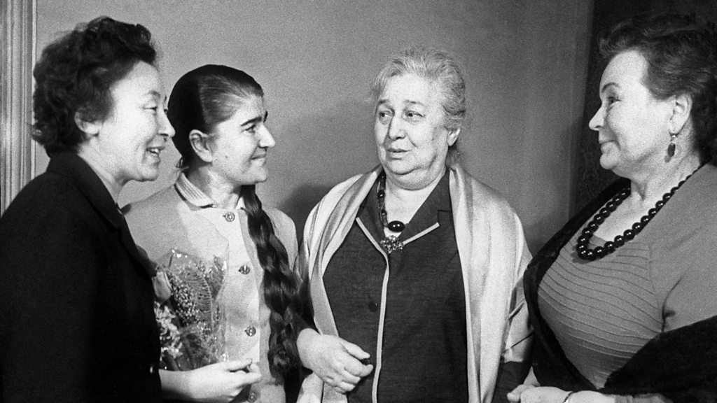 The great Russian poet Anna Akhmatova lived through some of the darkest chapters of Soviet history, but never stopped writing even though the communist regime repeatedly tried to silence her. One of Akhmatova's most famous poems, Requiem, is about the arrest of her son, Lev, and the Stalinist terror. The BBC's Tatyana Movshevich finds out more about the poem, and about Anna Akhmatova's life, from Era Korobova, an art historian who knew Akhmatova well. With thanks to Jasmine Hyde and Rebecca Crankshaw for their readings, and to Anna Akhmatova Museum at the Fountain House for the archive recording of Anna Akhmatova. PHOTO: Anna Akhmatova, centre right, at a Soviet writers conference in 1965 (Getty Images)