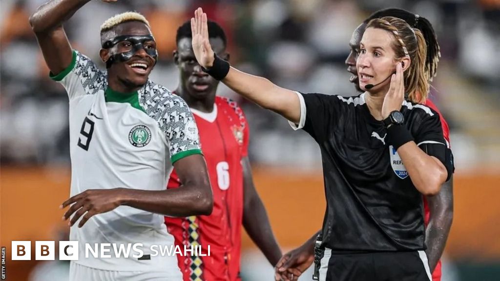 Maelezo ya picha, Mwamuzi wa Morocco Bouchra Karboubi ndiye aliyesimamia mechi ya Kundi A kati ya Nigeria na Guinea-Bissau kwenye Afcon 2023 kama sehemu ya timu ya waamuzi ya wanawake wote.