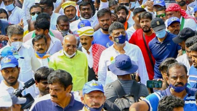 கொரோனா பாதுகாப்பு வழிகாட்டுதல்களை மீறி மேக்கேதாட்டு நோக்கி பேரணியாக செல்ல முயன்றதாக காங்கிரஸ் தலைவர்கள் மீது கர்நாடகா மாநில காவல்துறை வழக்கு பதிவு செய்துள்ளது.