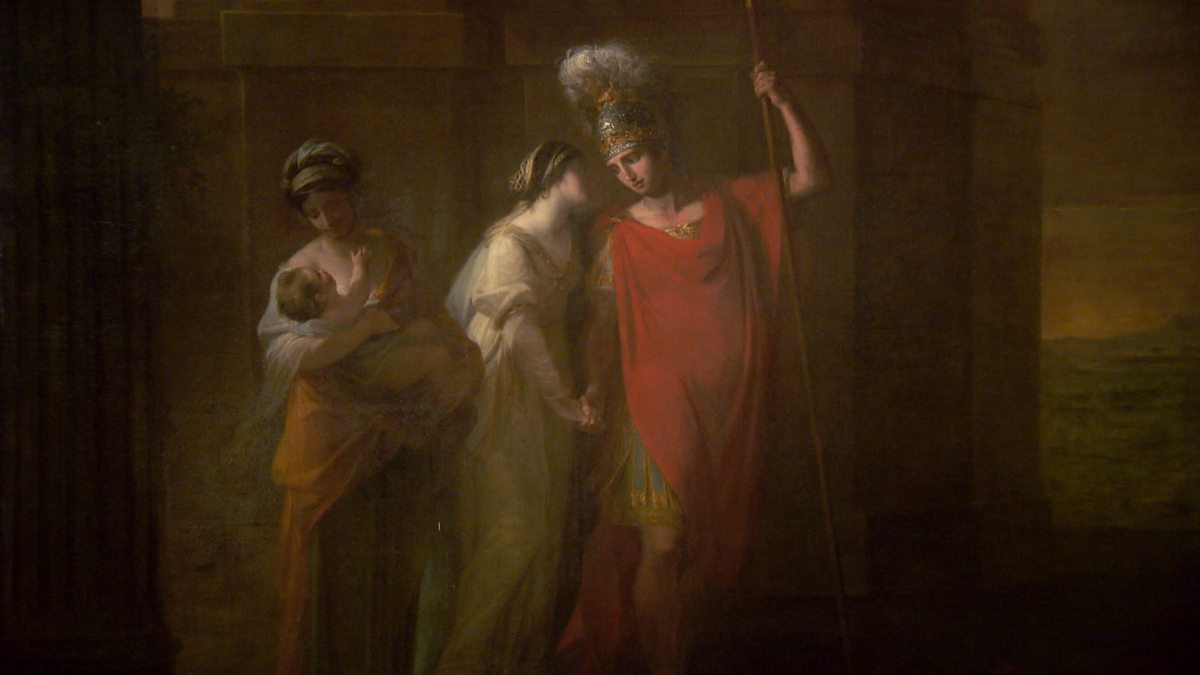 Instead, Kauffman presents him saying farewell to the lovely Andromache, who's weeping, "Don't leave me, don't make me a widow, don’t make our son an orphan."