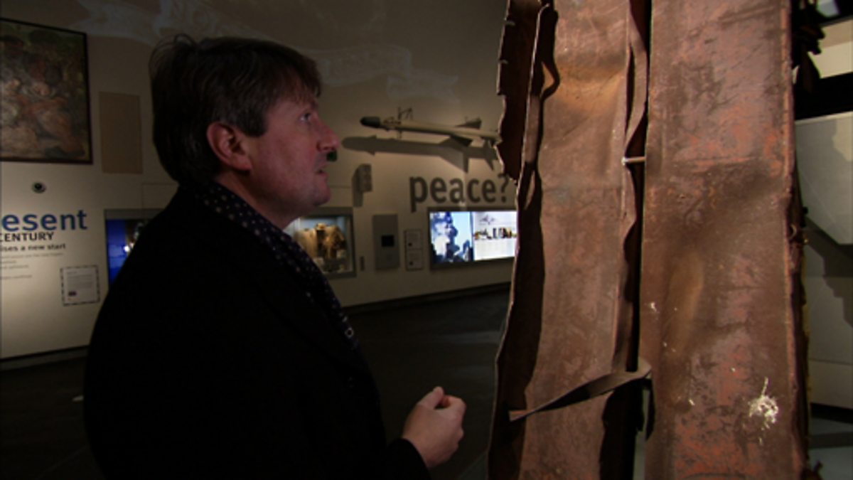 SIMON:This is girder sections from the North Tower. This would have come tumbling down under all that weight of the building and has arrived here in the Imperial War Museum, North. It's very moving to be standing here in front of it. In the poem, I talk about the gills of the building. These struts down the building, and that's what I was referring to, and these might well be those sections. I guess there's also the idea there of gills, a place where you're trying to breathe from. The extract from the poem was written to fit a piece of footage which was taken at the time. The frame of the picture wobbles around and can't always keep the person in the tower in focus, and to try and replicate that a little bit, I use repetition in the poem. So I've tried to get the nature of the poem to resemble the nature of that actual piece of film. In that respect there's a certain amount of irony in the poem, because the poem is written in a very controlled way, fairly neat stanzas with the same number of lines in each one, and I suppose what I'm trying to do there is to contain the tension, to build up that sense of stress, and panic. So in the same way that the lens of the camera finds the man in the building, so the poem focuses on him and describes his situation, and he becomes a metaphor for everyone. Everyone's terror, everyone's fear, and everyone's heartbreak.