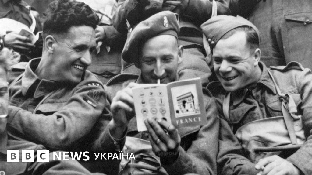 Підпис до фото, Британські солдати читають путівник Францією для туристів на борту десантного катера, що прямує до Нормандії, Ла-Манш, 1944 рік