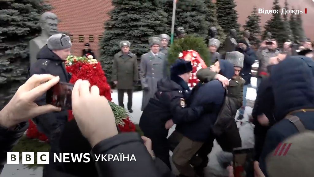 Двоє активістів пожбурили квітами в погруддя на могилі Йосипа Сталіна, коли на Красній площі у Москві відзначали 66 річницю з дня смерті радянського диктатора.