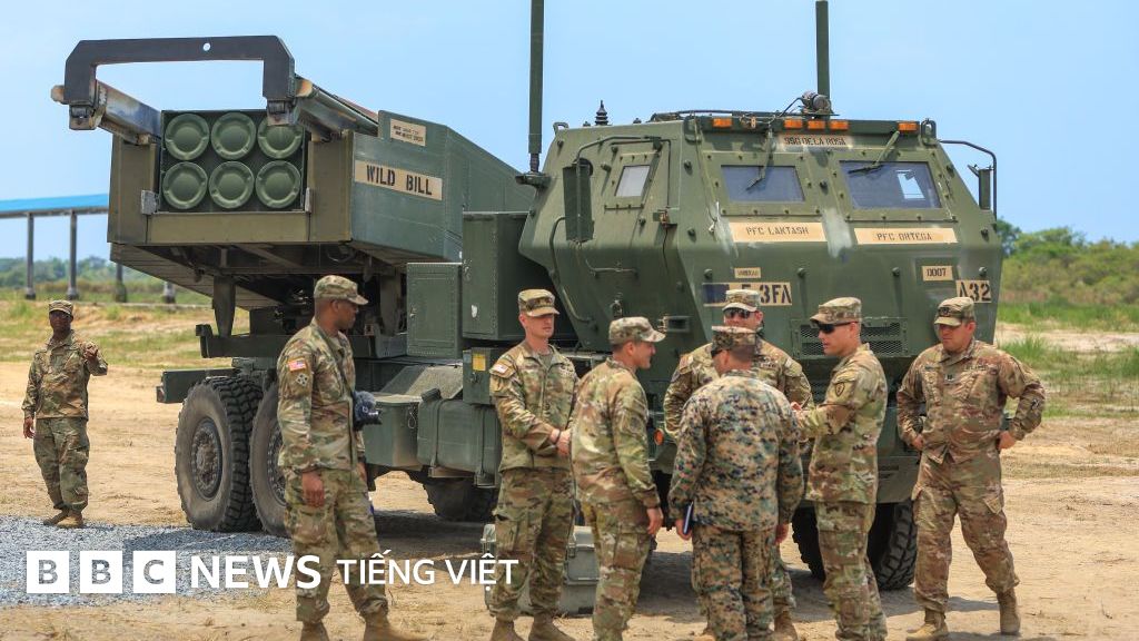 Chụp lại hình ảnh, Binh lính Mỹ trước bệ phóng pháo phản lực HIMARS trong khuôn khổ đợt tập trận Balikatan năm 2023 của Mỹ và Philippines
